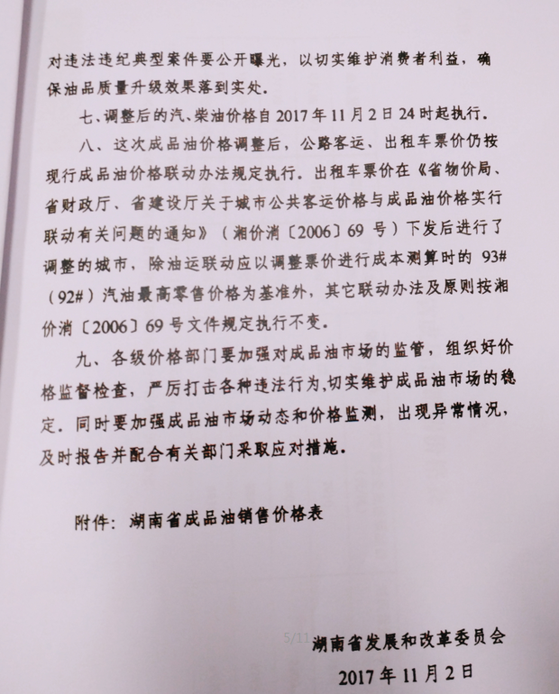 关于调整成品油价格的通知 湘发改电[2017]7号