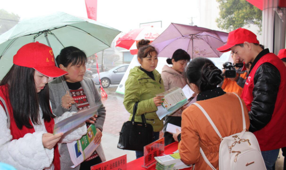 启动日当天天降大雨,志愿者们不顾风大雨大,冒雨在宣传台前进行农保政策宣传,分发政策宣传单,维持现场秩序,整个志愿活动虽遭遇恶劣天气,但秩序井然。