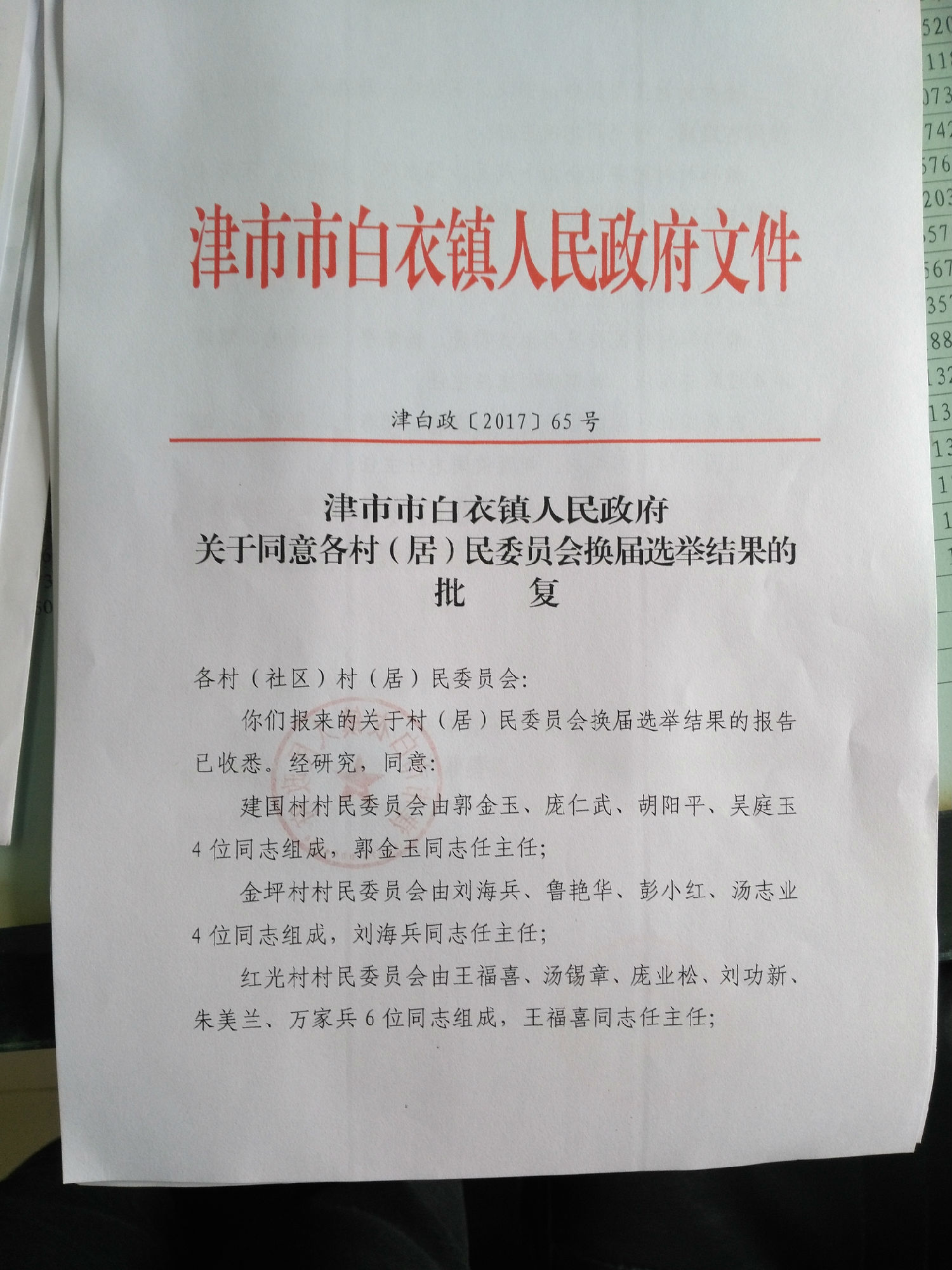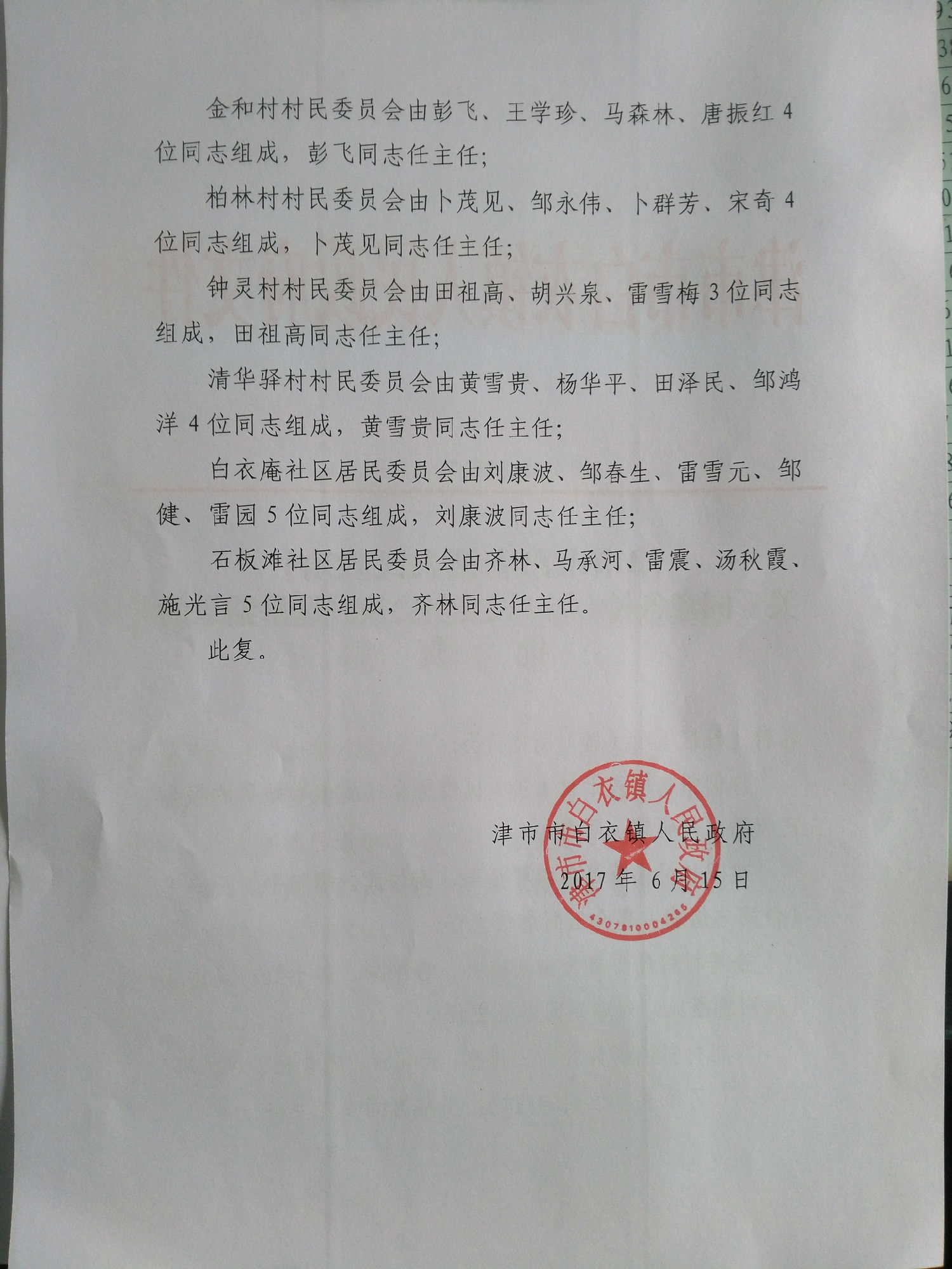 津市市白衣镇人民政府关于同意各村(居)民委员会换届选举结果的批复