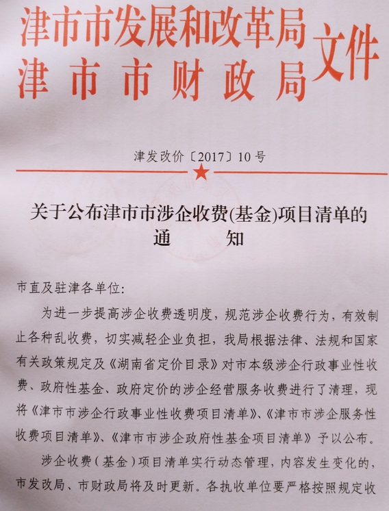 关于公布津市市涉企收费(基金)项目清单的通知