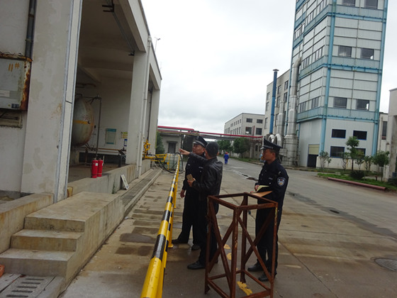 10月19日,嘉山派出所所长彭军再次带领民警前往湖南省鸿鹰祥生物科技有限公司进行了安全检查,该公司硫酸、盐酸存放仓库已及时安装防护栏,悬挂了醒目的应急预案,并在仓库周边安装了监控设施,确保企业生产安全和危险化学品的存放、使用安全。