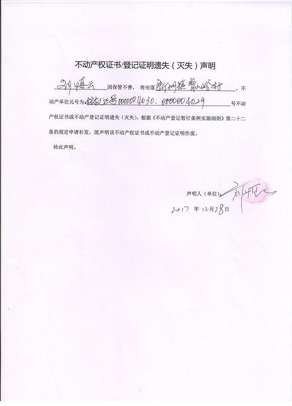 不动产权证书\登记证明遗失(灭失)声明