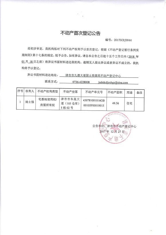 不动产首次登记公告2017-044