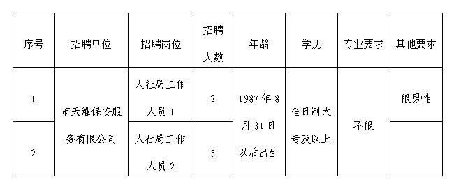 因工作需要,津市市天维保安服务有限公司拟面向社会公开招聘劳务派遣人员7名,定向派遣到津市市人力资源和社会保障局及下属事业单位工作,现将有关事项公告如下: