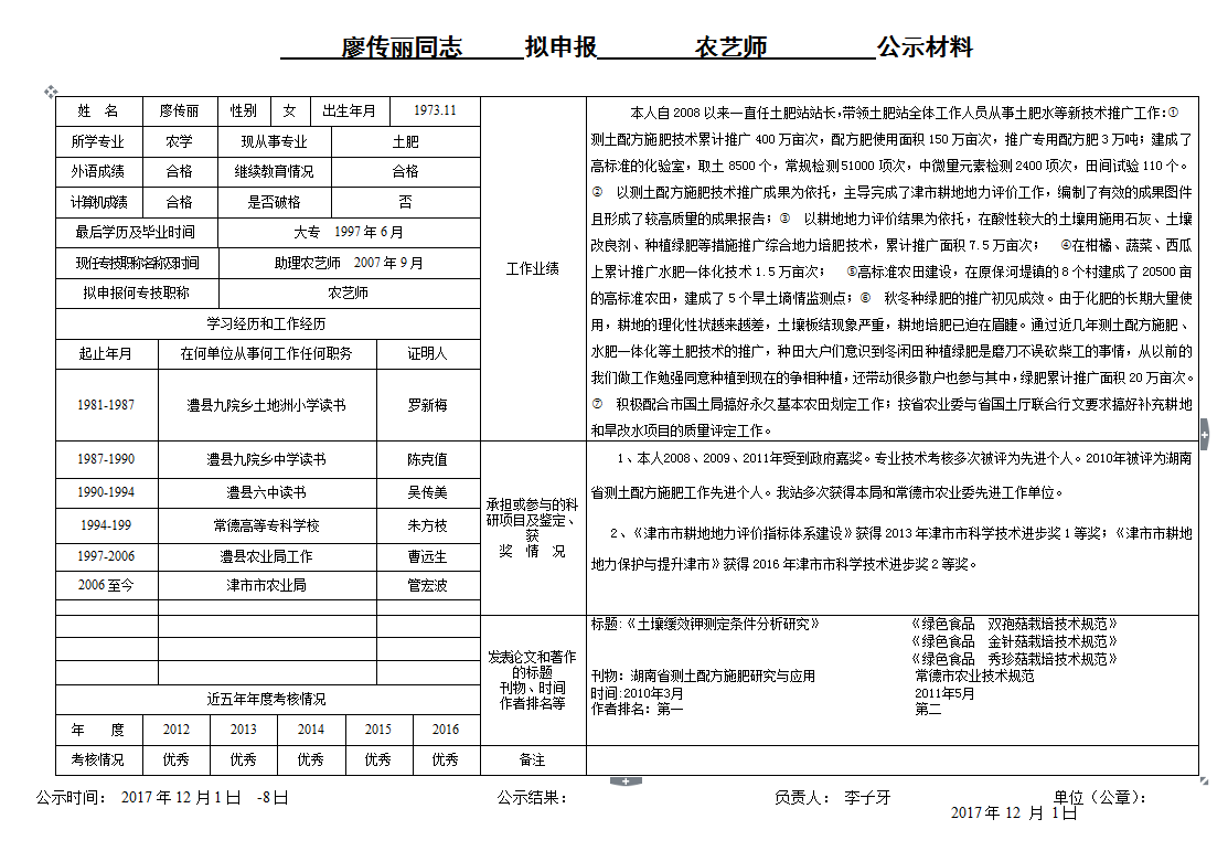 津市市农业局廖传丽拟申报高级农艺师公示材料