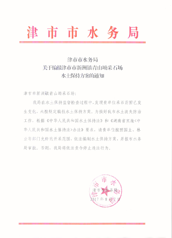 关于编报津市市新洲镇青山坳采石场水土保持方案的通知